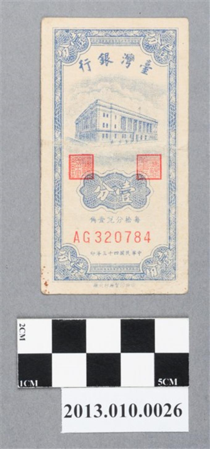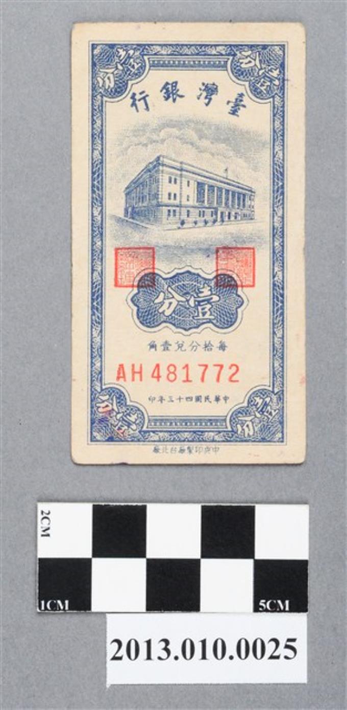 中央印製廠臺北廠壹分臺灣銀行新臺幣