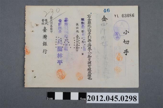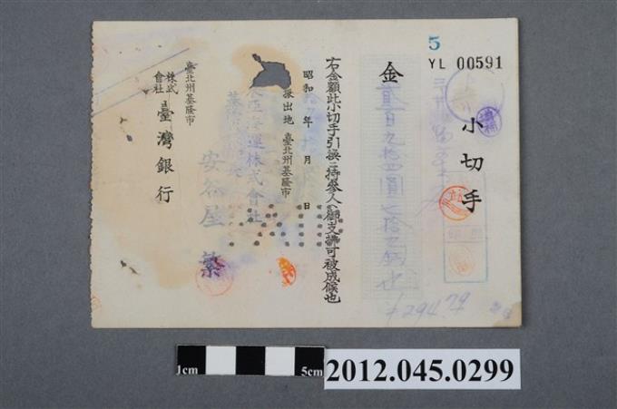 昭和19年基隆市臺灣銀行貳百九拾四圓七拾九錢圓支票