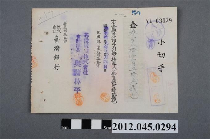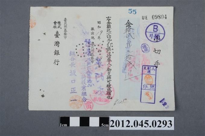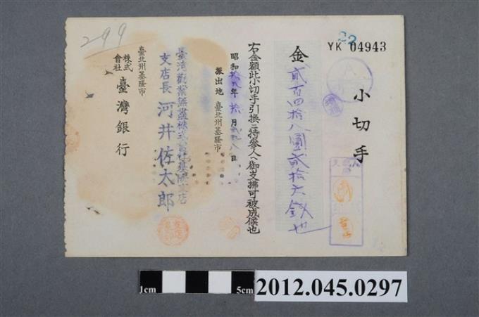 昭和19年基隆市臺灣銀行貳百四拾八圓貳拾六錢支票