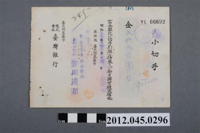 昭和19年基隆市臺灣銀行貳拾八圓九拾五錢支票