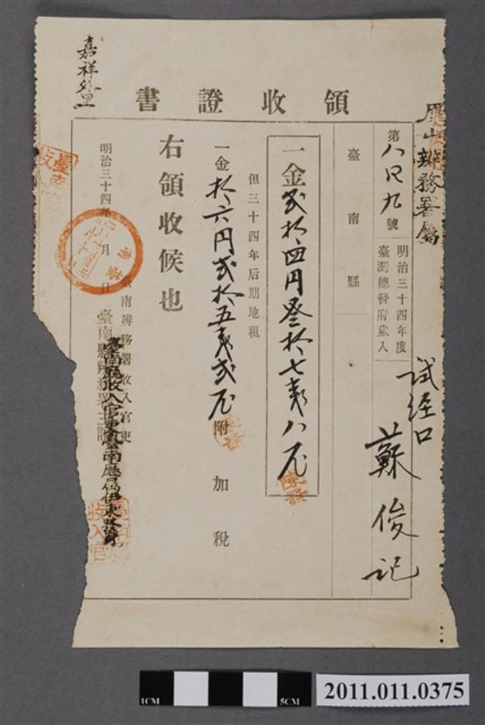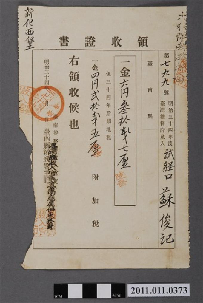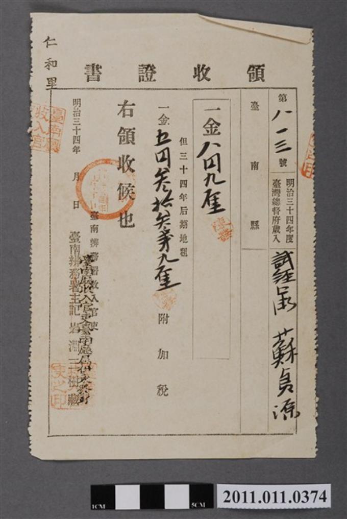 明治34年臺南廳發給蘇貞源之地租完稅收據