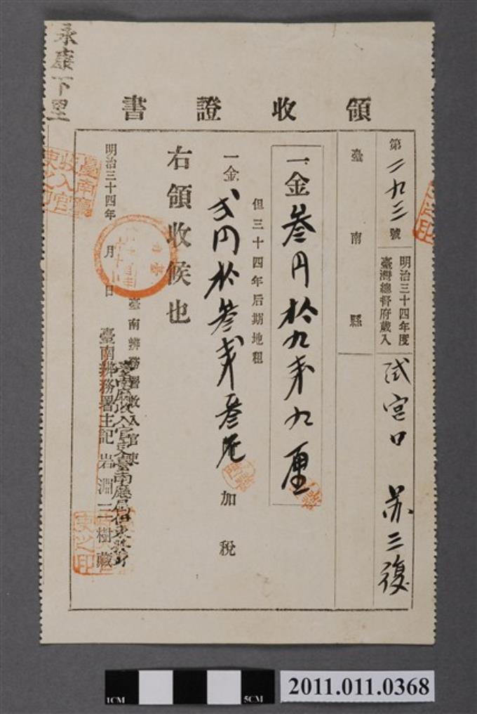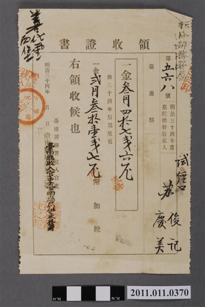 明治34年臺南廳發給蘇俊記蘇慶美地租完稅收據