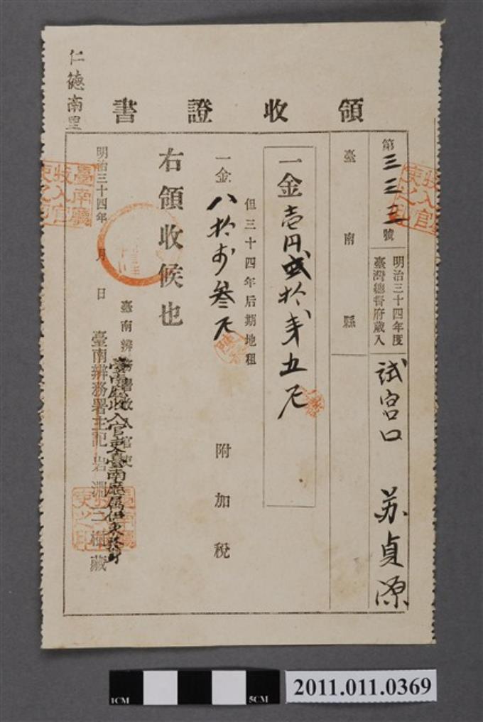 明治34年臺南廳發給蘇貞源地租完稅收據