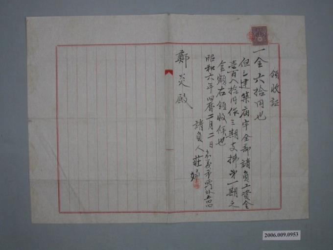 昭和6年莊婦給鄭炎收據