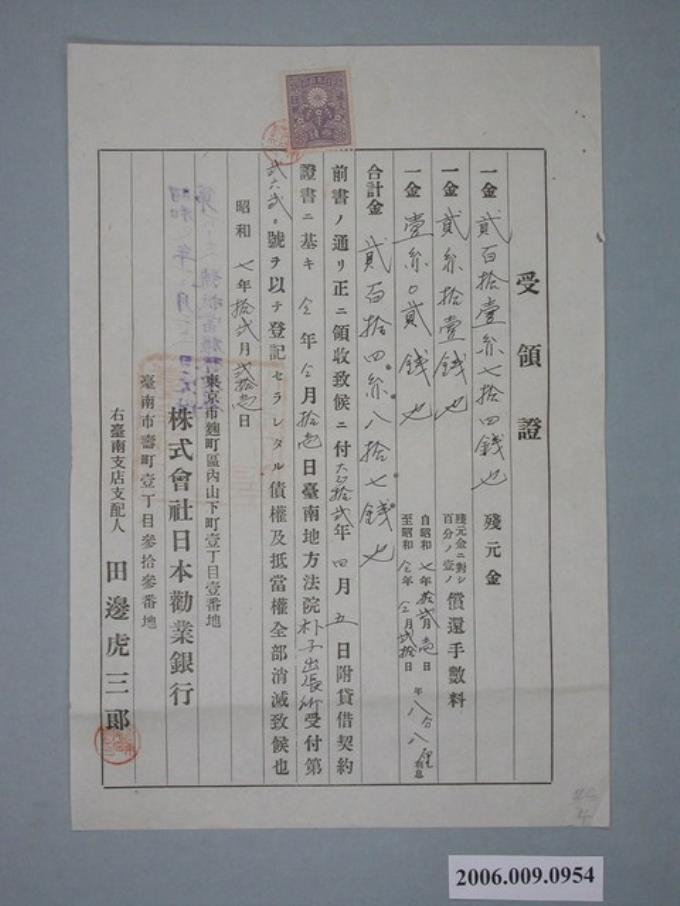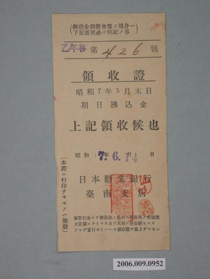 昭和7年株式會社日本勸業銀行臺南支店收據