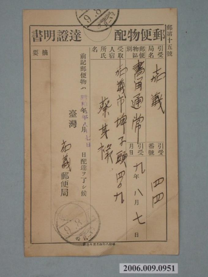 昭和9年嘉義郵便局郵件寄送到達證明書