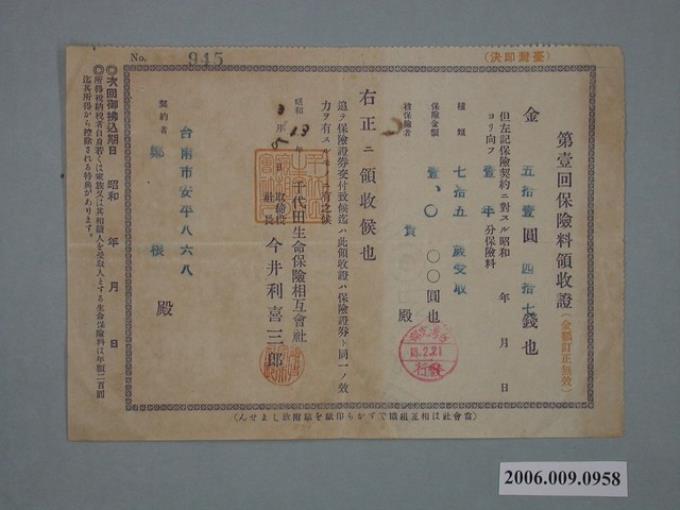 昭和13年千代田生命保險相互會社給鄭炎第壹回保險費收據