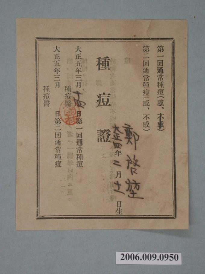 大正5年鄭啟堃第一回種痘證