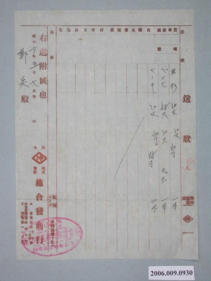 昭和6年淡水坤株式會社施合發商行給鄭炎收據