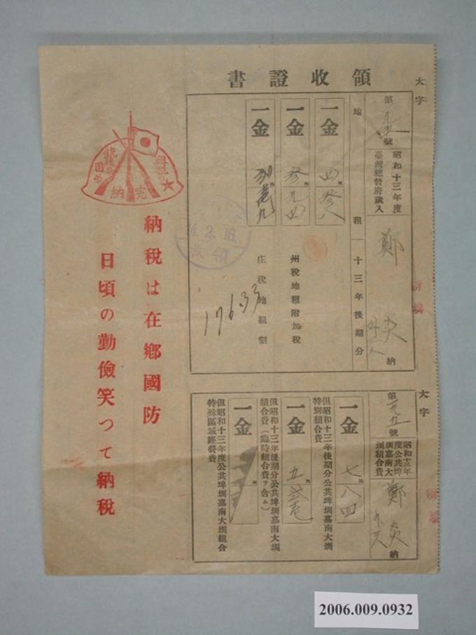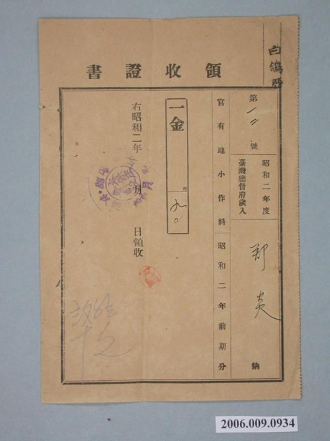 昭和2年太保庄役場給鄭炎收據
