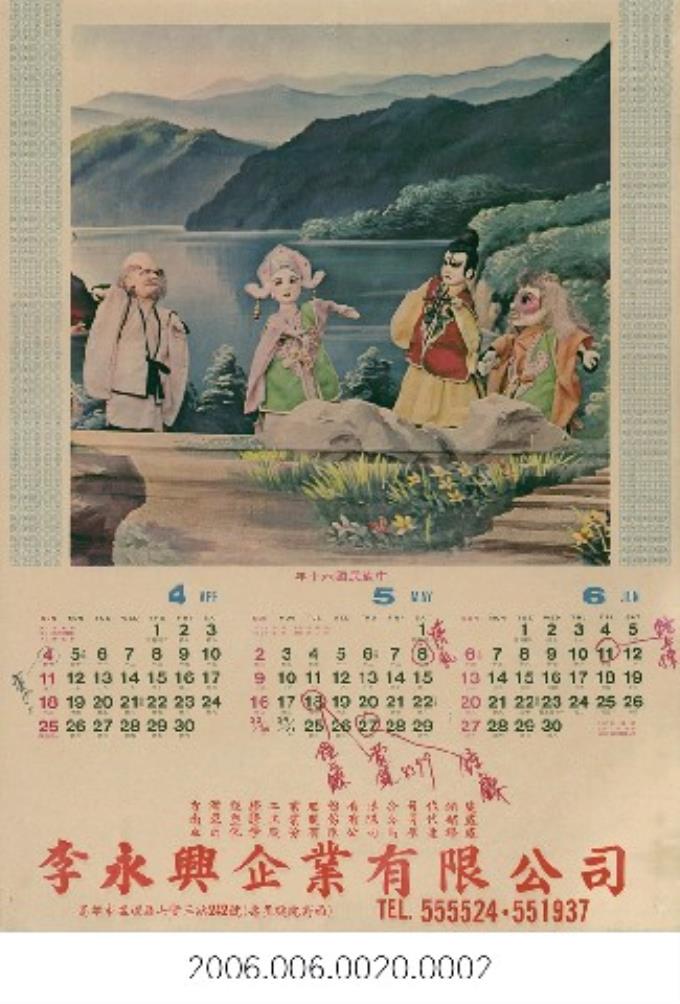 李永興企業有限公司發行民國60年史艷文布袋戲圖廣告月曆4、5、6月