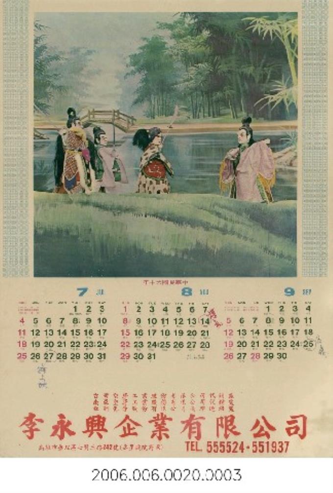 李永興企業有限公司發行民國60年史艷文布袋戲圖廣告月曆7、8、9月