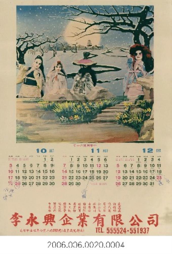 李永興企業有限公司發行民國60年史艷文布袋戲圖廣告月曆10、11、12月