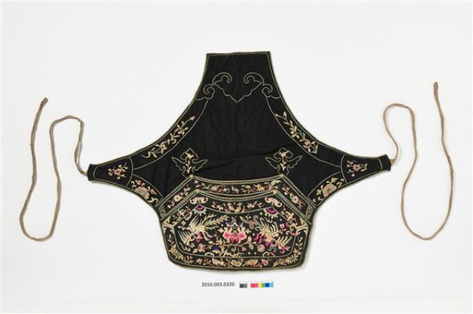 黑色地彩繡牡丹飛鳳下端寬形附綁帶肚兜