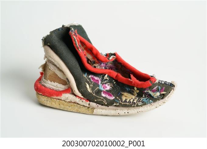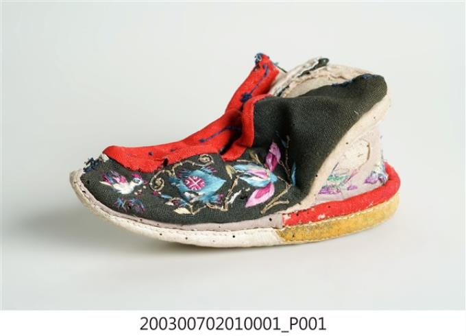 黑地繡花高跟弓鞋右足