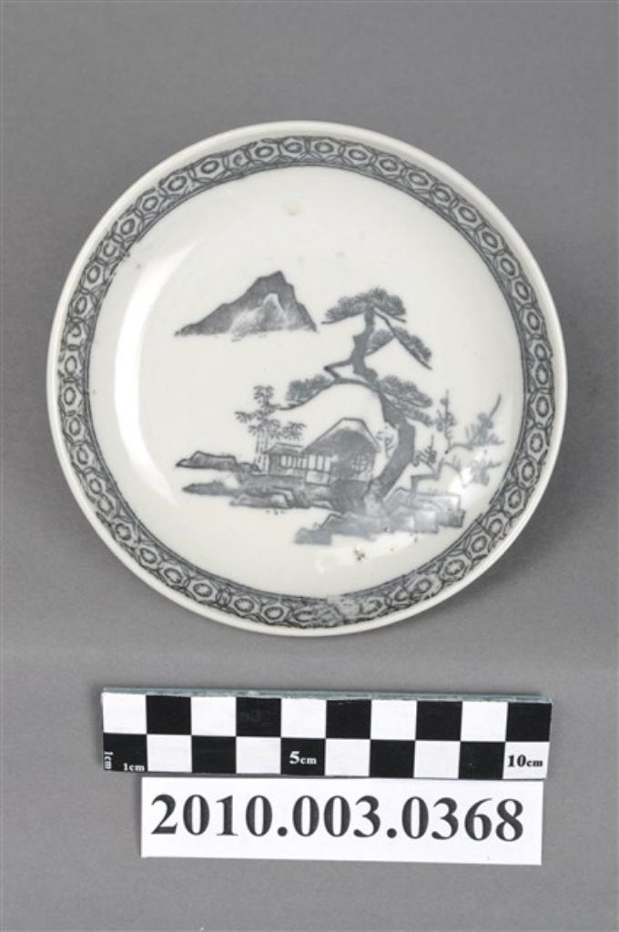 印花釉下彩松樹人家圖圓碟