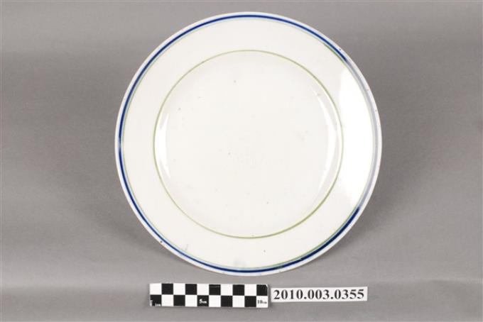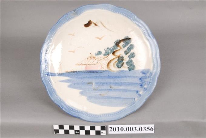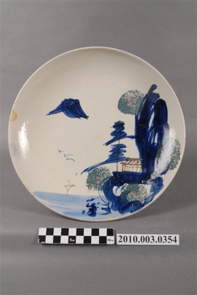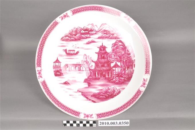 釉上彩轉寫紙貼花山水樓閣圖圓盤
