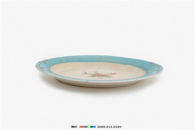 青花粉紅彩釉印花薔薇紋橢圓盤