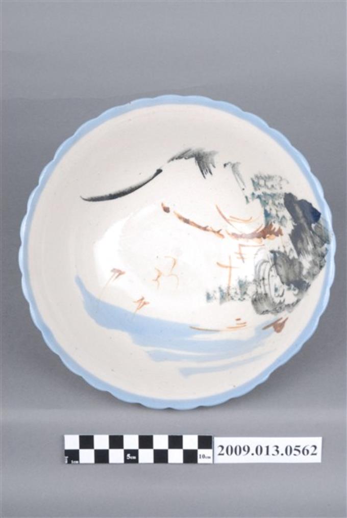 淡藍釉彩繪山水紋菱花口碗
