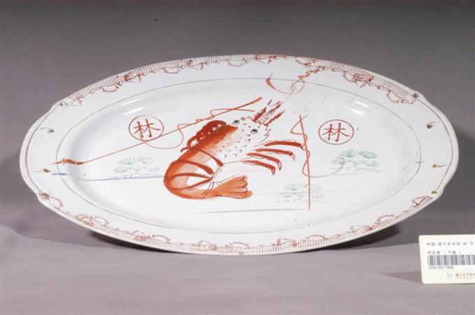 印繪紅蝦折沿淺橢圓盤