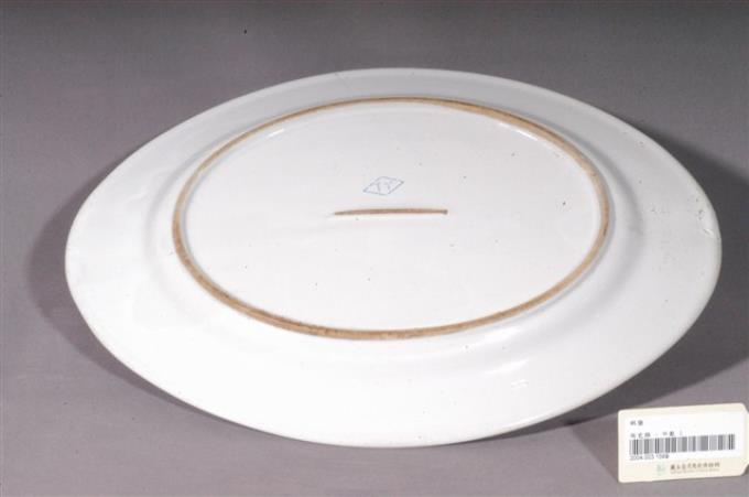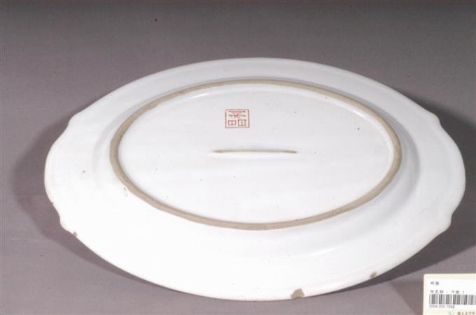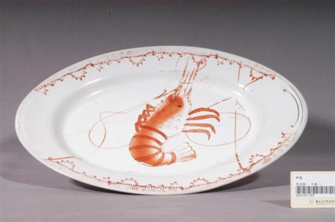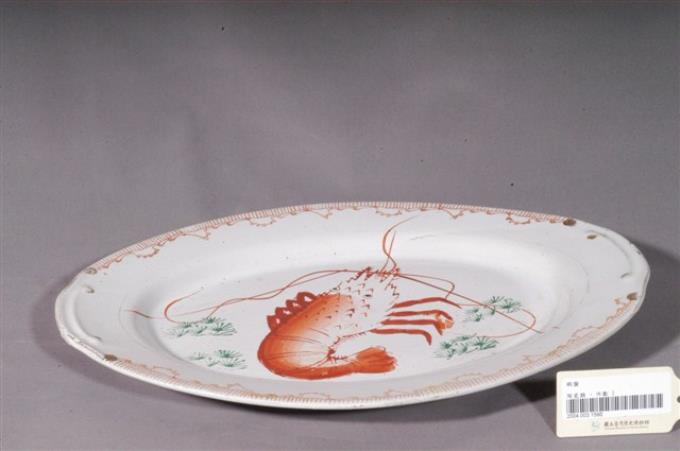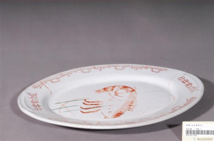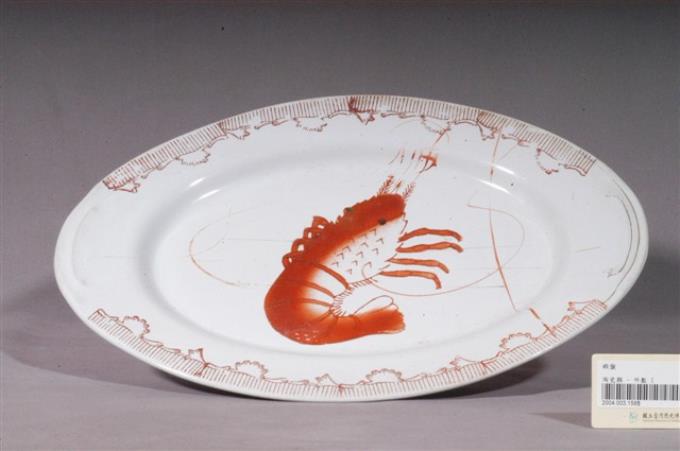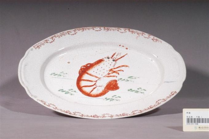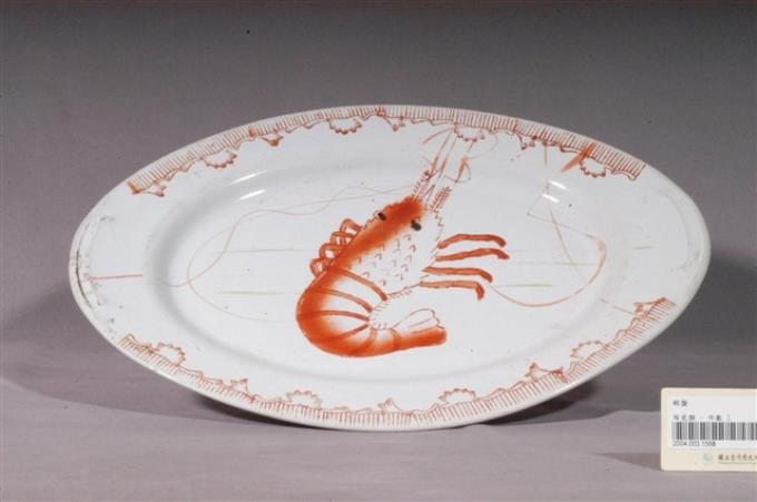 印繪紅蝦折沿淺橢圓盤