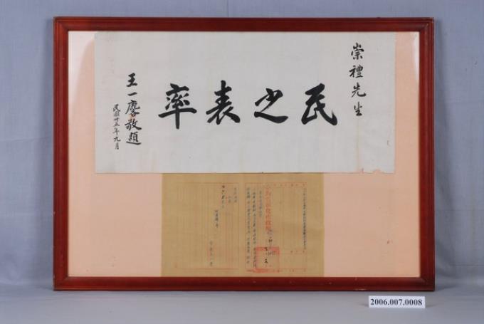 民國35年彰化市長王一麐贈李崇禮「民之表率」匾