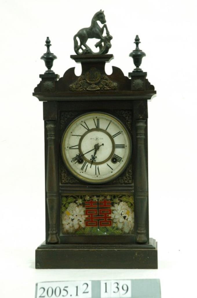 中國山東煙臺永康造鐘無限公司製彩繪雙喜牡丹馬頭機械木座鐘