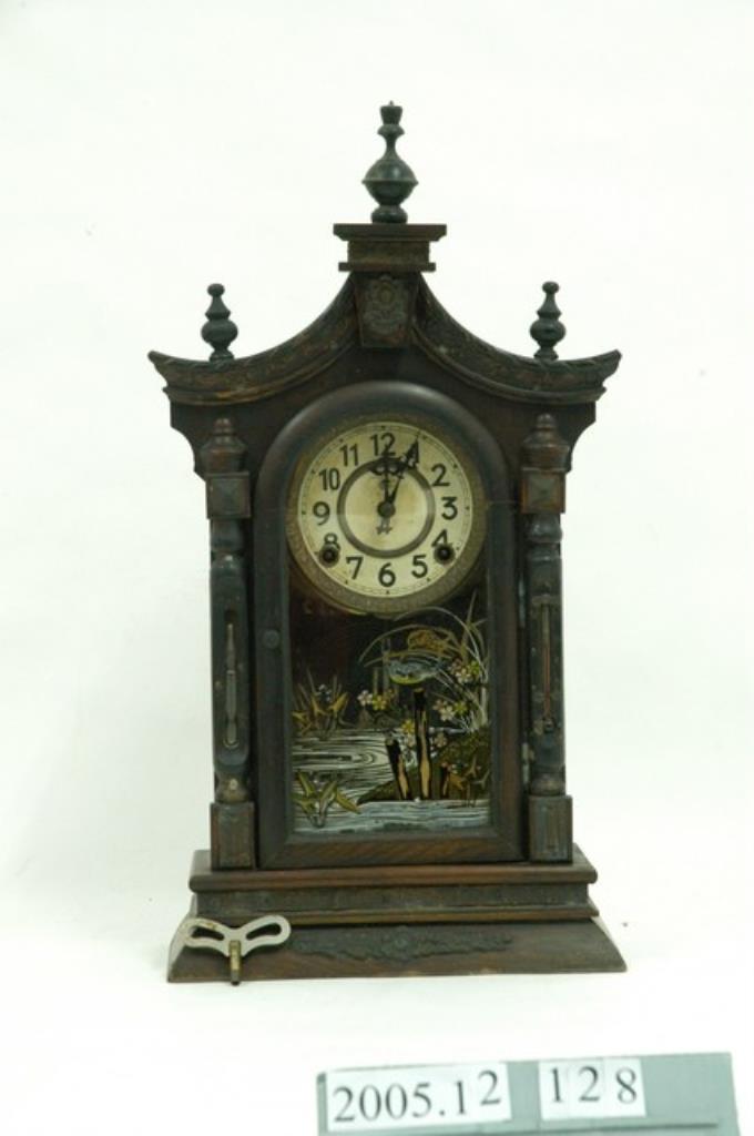 日本尾張時計株式會社製彩繪花鳥玻璃尖頂式木座鐘組