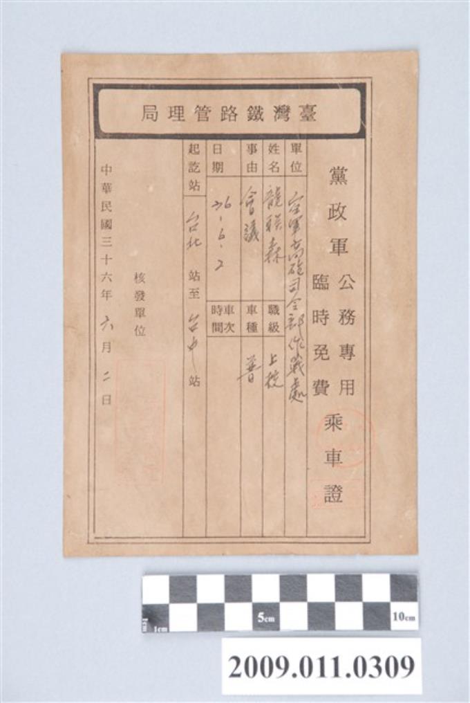 臺灣鐵路管理局黨政軍公務專用臨時免費乘車證