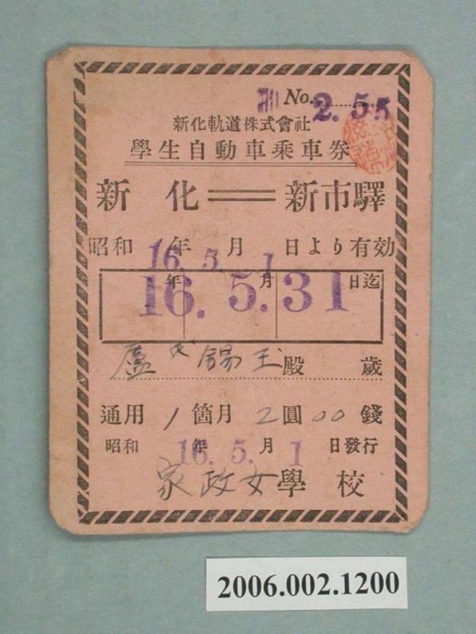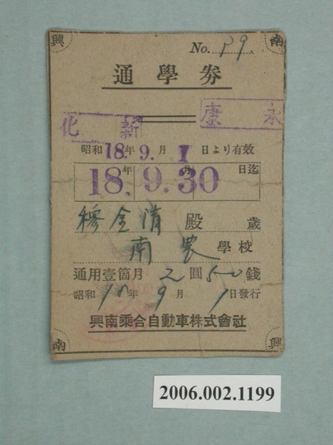 興南乘合自動車株式會社南農學校新化至永康通學券