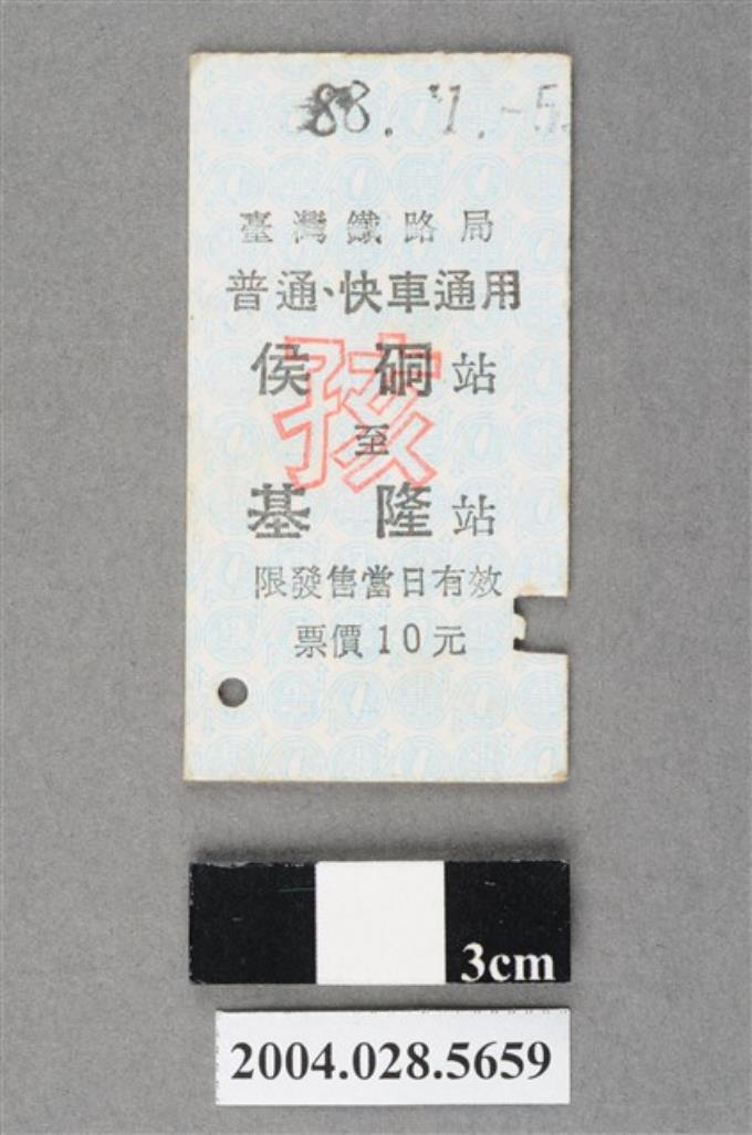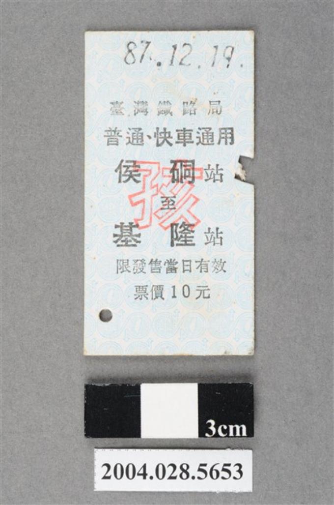 臺灣鐵路局普通及快車通用侯硐至基隆站孩童票