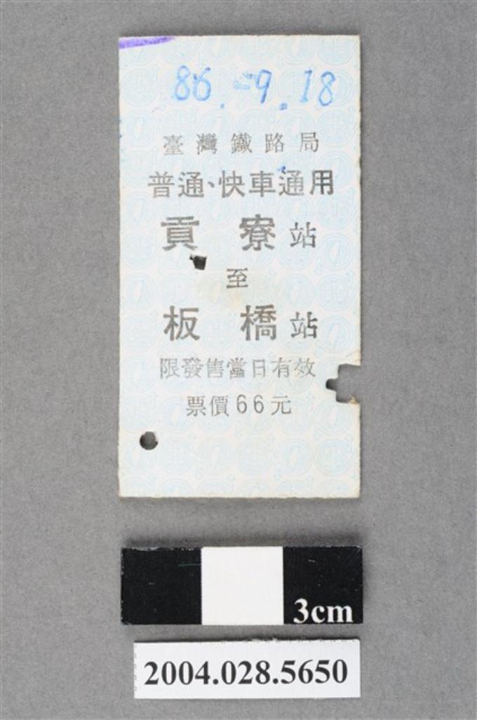 臺灣鐵路局普通及快車通用貢寮至板橋站車票