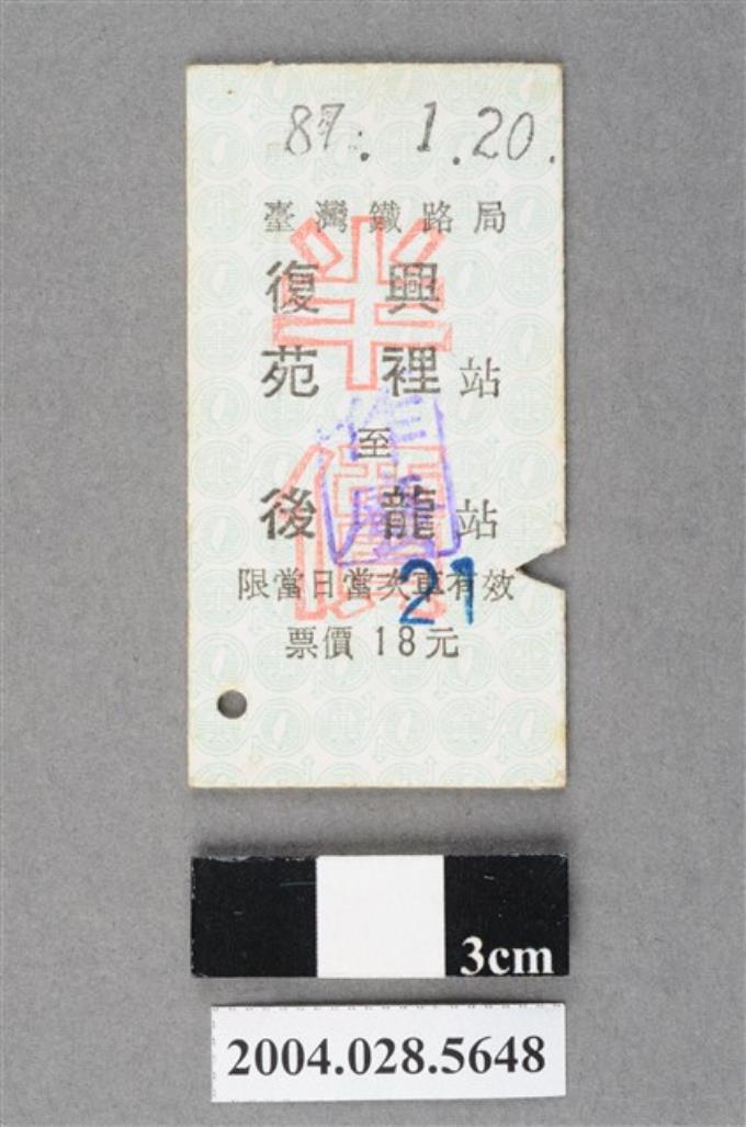 臺灣鐵路局復興號苑裡至後龍站車票