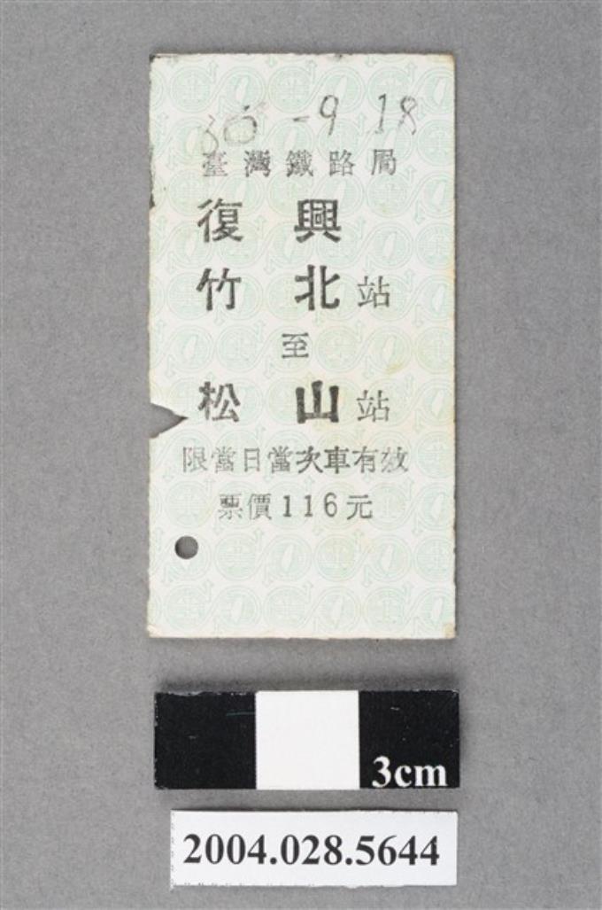 臺灣鐵路局復興號竹北至松山站車票