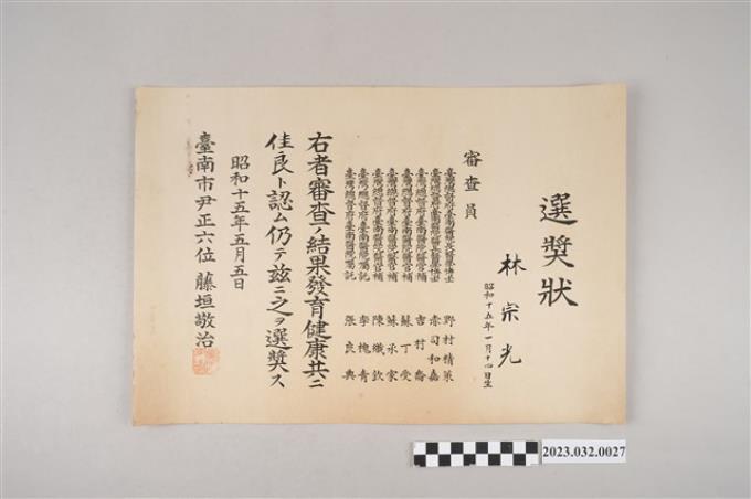 昭和15年5月5日林宗光獲選發育健康優良獎狀