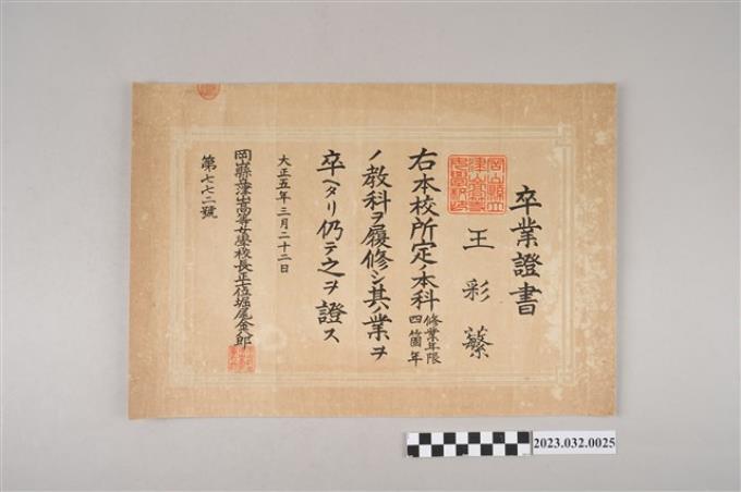 大正5年3月22日王采蘩日本岡山縣立津山高等女學校畢業證書