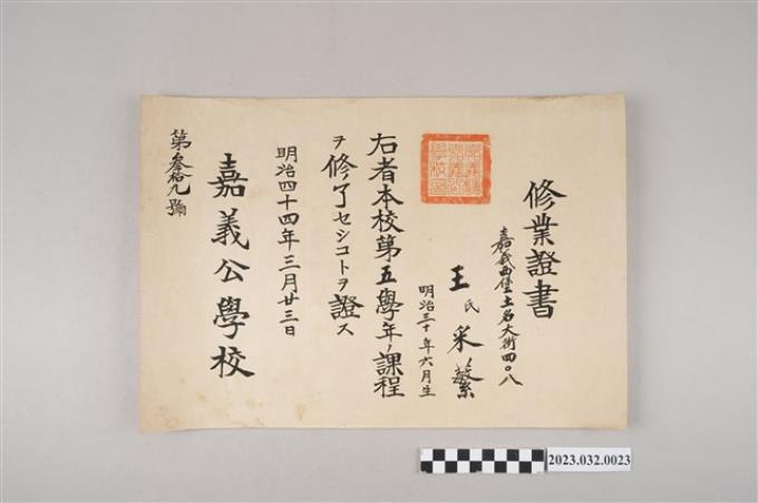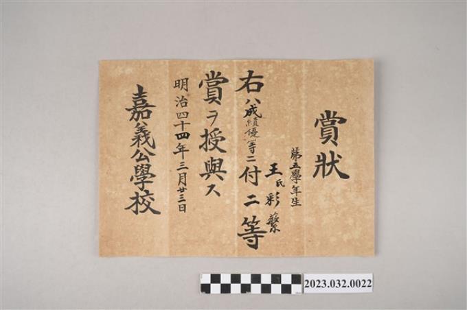 大正5年3月23日王采蘩日本岡山縣立津山高等女學校射術證明書