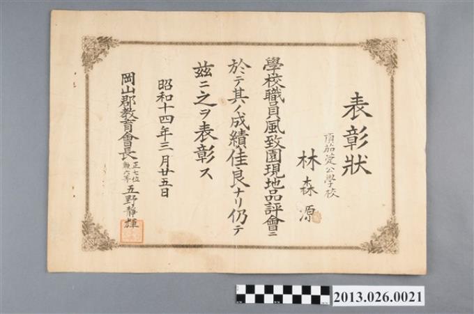 昭和14年頂茄萣公學校學校職員風致園現地品評會成績優良獎狀