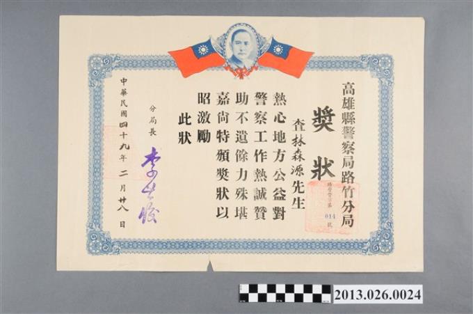1960年高雄縣警察局路竹分局獎勵林森源熱心地方公益獎狀