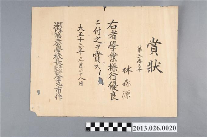 大正13年湖內第二公學校林森源操性優良獎狀