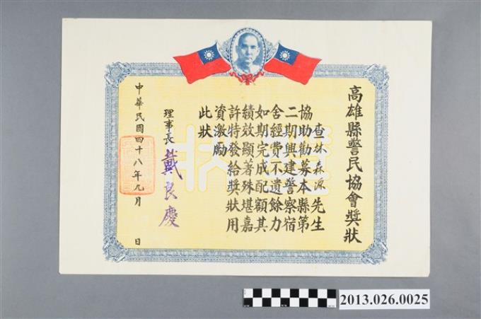 1959年高雄縣警民協會對林森源協助勸募第二期興建警察宿舍經費不遺餘力獎狀