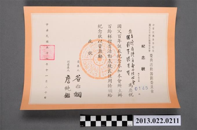 民國54年張星賢參加國父百年誕辰紀念百齡杯體育活動紀念狀