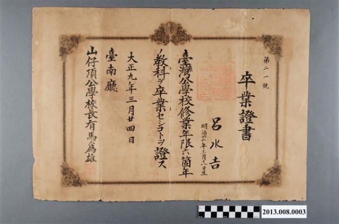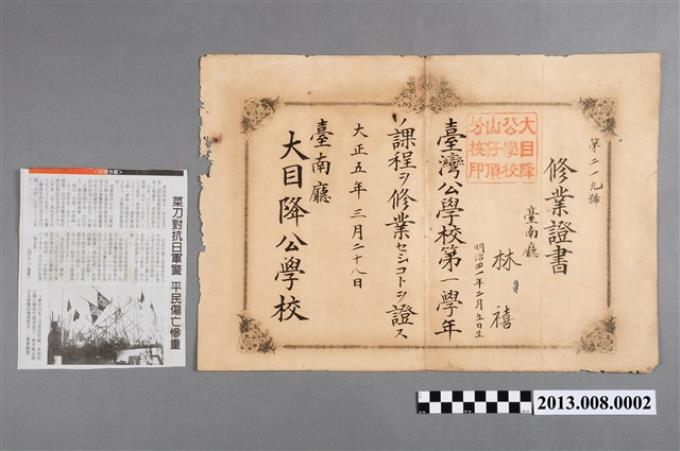 林禧臺南廳大目降公學校山仔頂分校修業證書