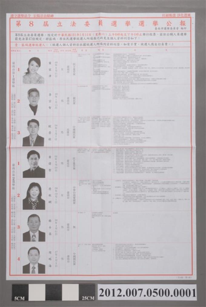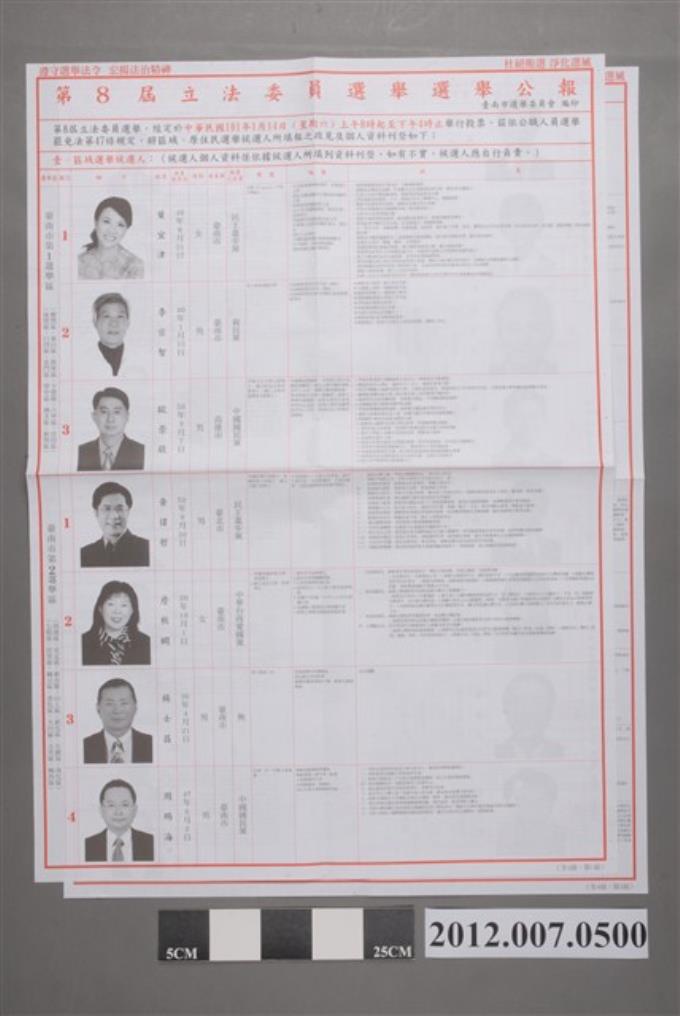 臺南市選舉委員會編印《第8屆立法委員選舉選舉公報》