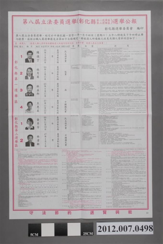 彰化縣選舉委員會編印《第8屆立法委員選舉選舉公報第1選舉區、第2選舉區》