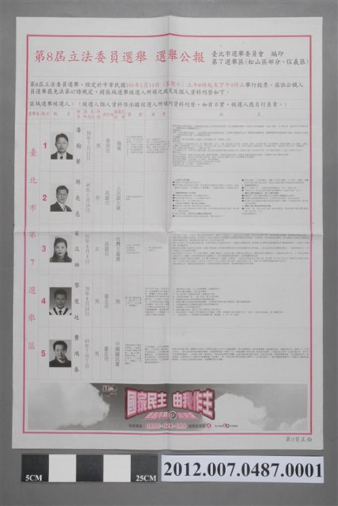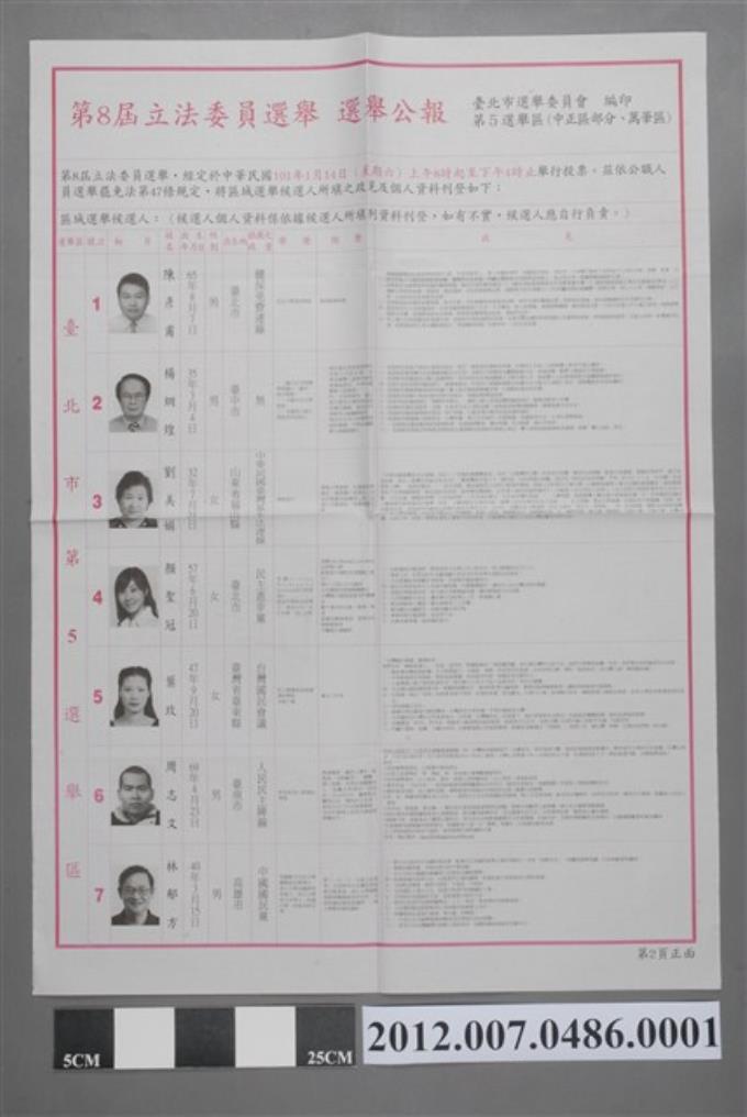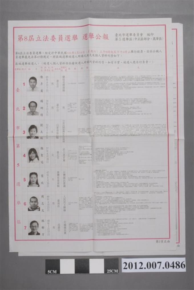 臺北市選舉委員會編印《第8屆立法委員選舉選舉公報第5選舉區(中正區部分、萬華區)》