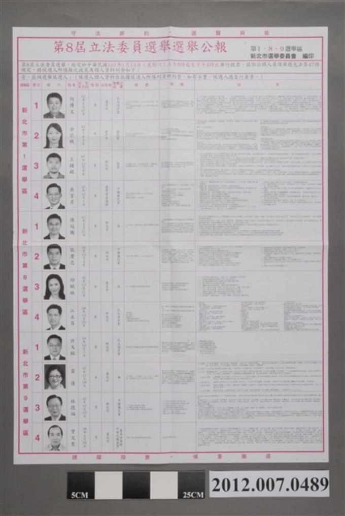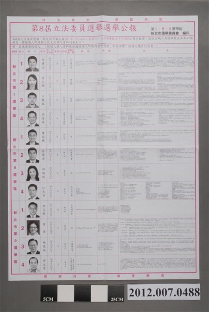 新北市選舉委員會編印《第8屆立法委員選舉選舉公報第1、8、9選舉區》