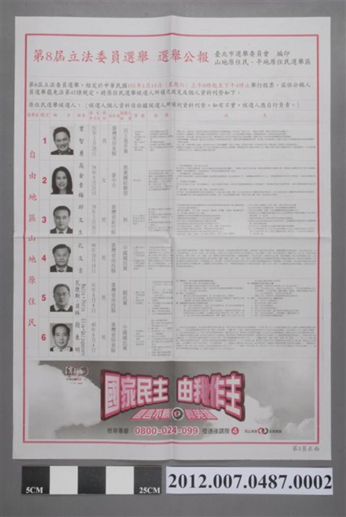 臺北市選舉委員會編印《第8屆立法委員選舉選舉公報山地原住民、平地原住民選舉區(中正區部分、萬華區)》