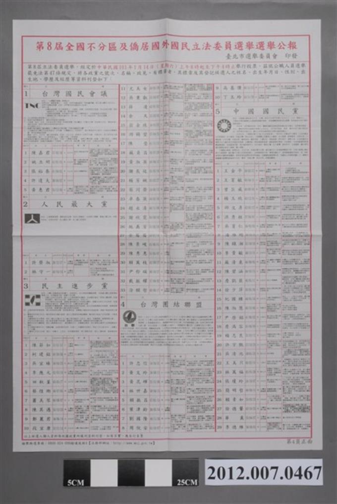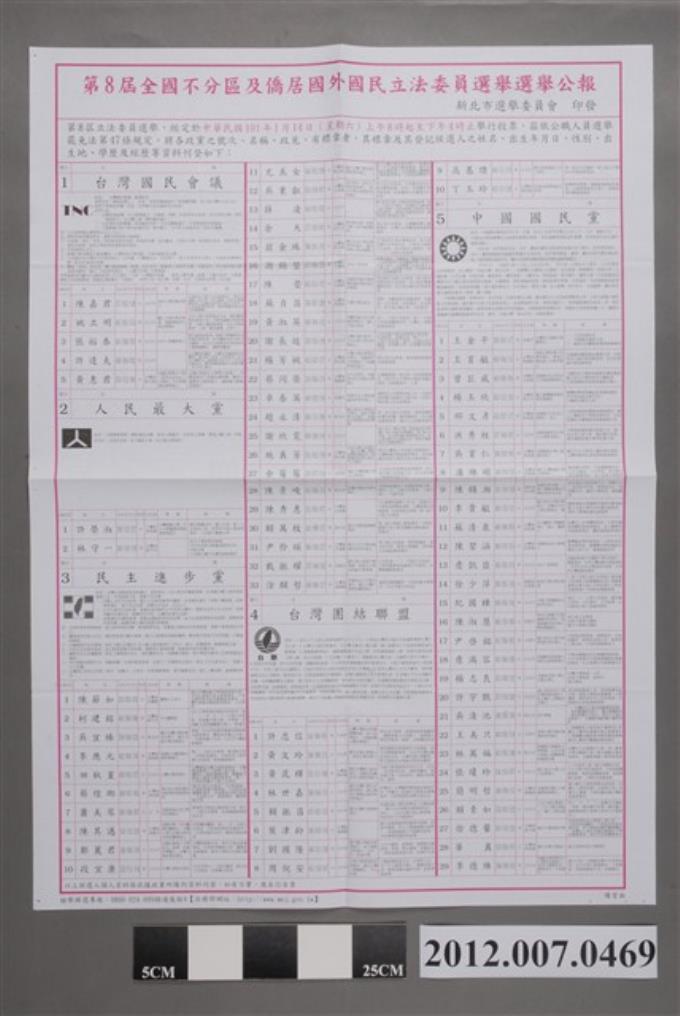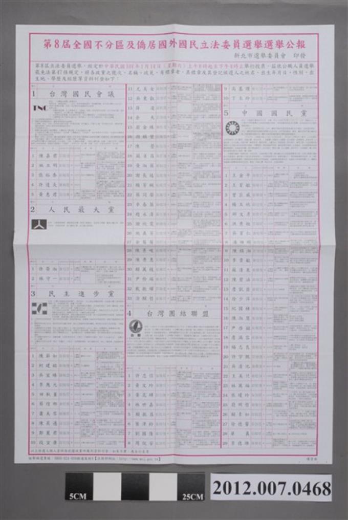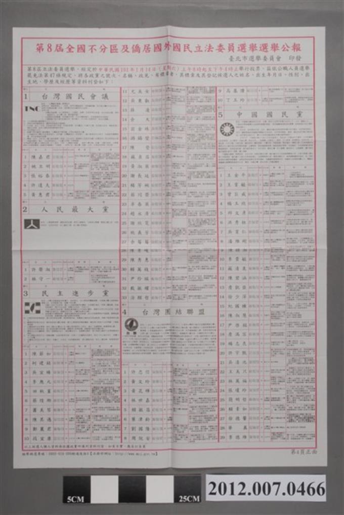 臺北市選舉委員會印發《第8屆全國不分區及僑居國外國民立法委員選舉選舉公報》