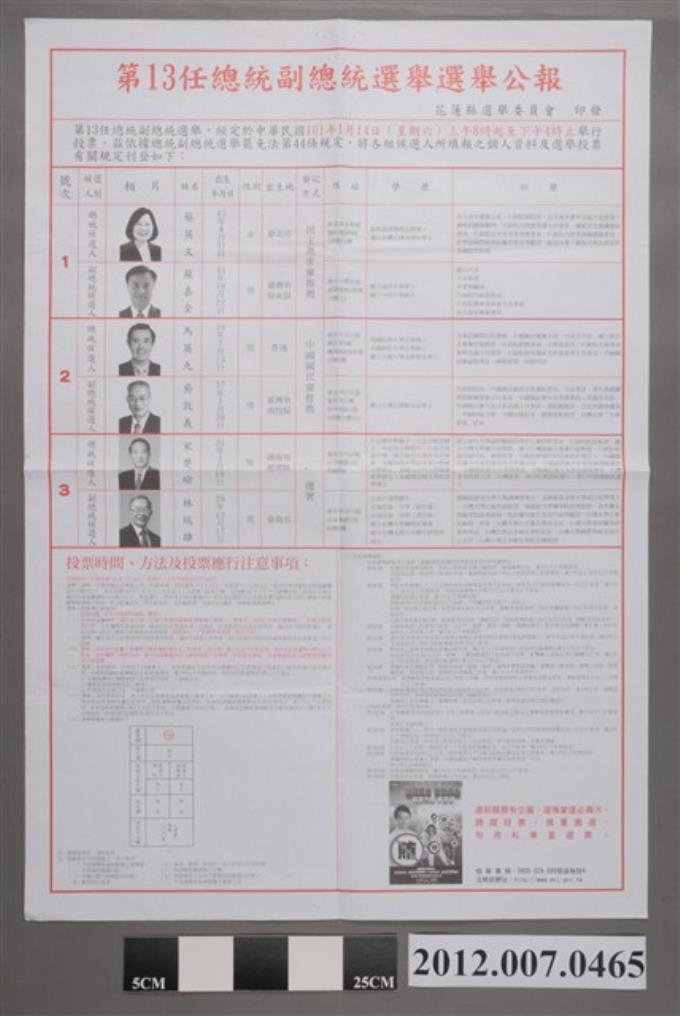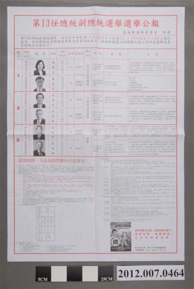 花蓮縣選舉委員會印發《第13任總統副總統選舉選舉公報》
